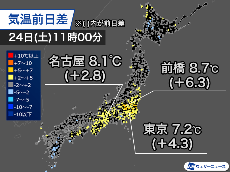 11時00分の気温は東京都心で昨日より4.3℃高い7.2℃、前橋市は6.3℃高い8.7℃とだいぶ寒さが和らぎました。名古屋市も2.8℃高い8.1℃まで上がっています。
