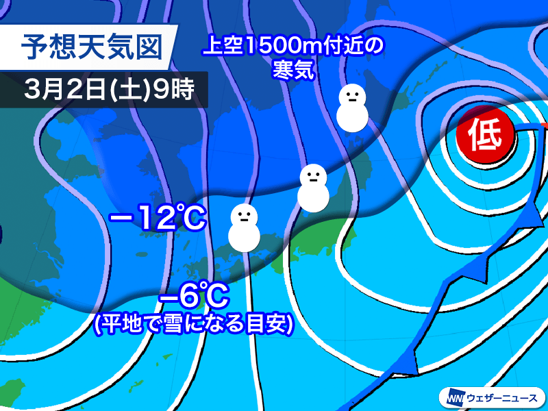 平地で雪を降らせる目安の上空1500m付近で−6℃以下の寒気が九州や四国付近まで南下し、北日本にはさらに強い−12℃以下の寒気が流れ込むとみられます。これだけ強い寒気が南下するのは1月下旬以来です。