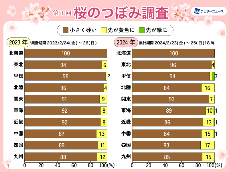 今回のつぼみ調査ではほとんどが「小さく硬い」つぼみであることがわかりました。ただ、2月中旬にかけては季節はずれの暖かさとなり、平年を大きく上回る気温で経過したため、東海以西などでは「先が黄色に」変化したつぼみがみられます。少しずつですが、つぼみの生長が始まってきたようです。