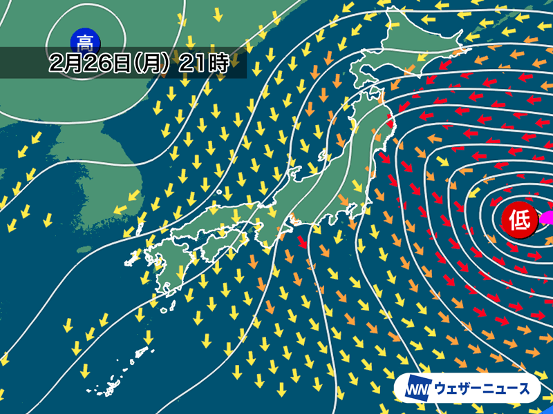 今日26日(月)は低気圧が東へ離れて、太平洋側を中心に天気が回復したところが多くなっています。ただ、低気圧が日本の東で発達しているため、東西の気圧差が大きく(等圧線の間隔が狭い)、各地で風が強くなっています。