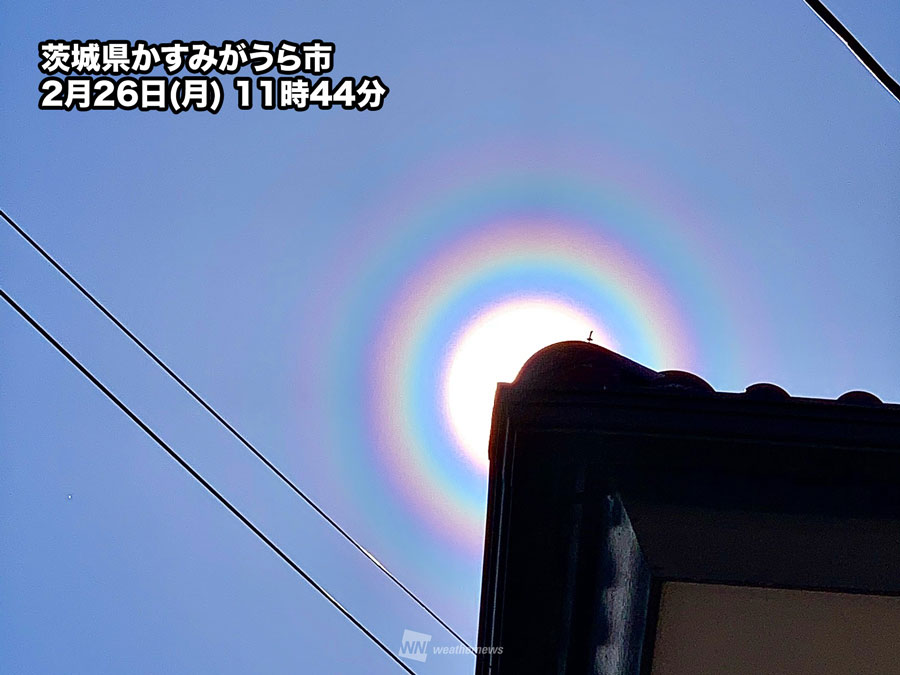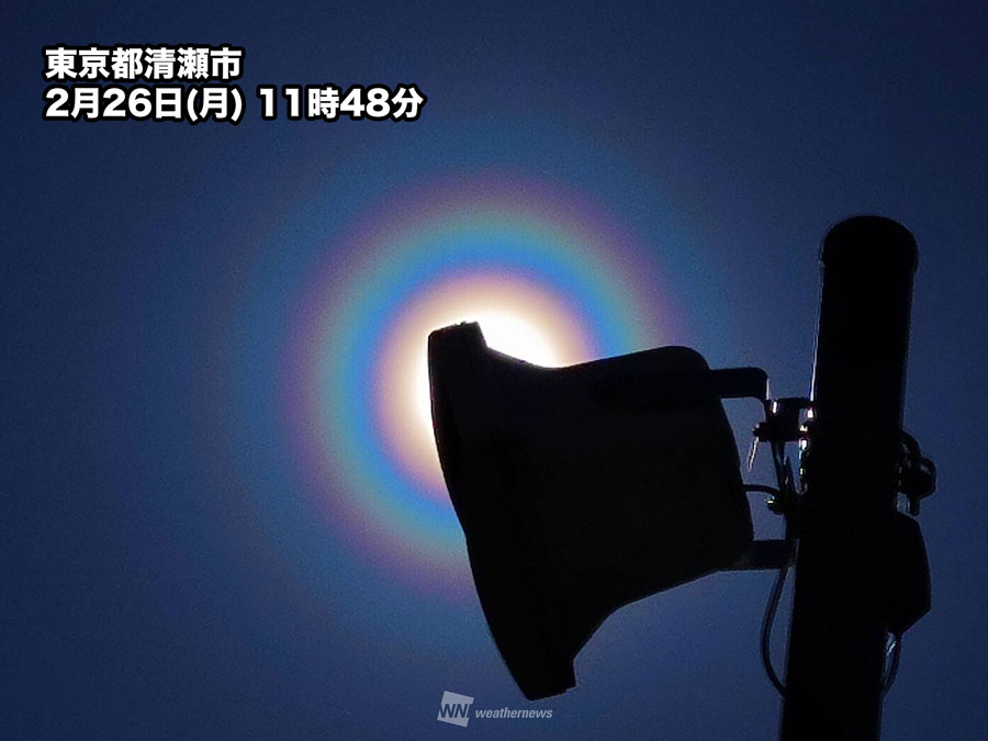 「花粉光環」とは、花粉の粒子によって太陽の光に回折・干渉が生じ、色が分かれて見える現象です。太陽の周囲を囲むように幾重にも虹色の環が見られるのが特徴で、花粉の飛散量が多いほどはっきりと見られます。
