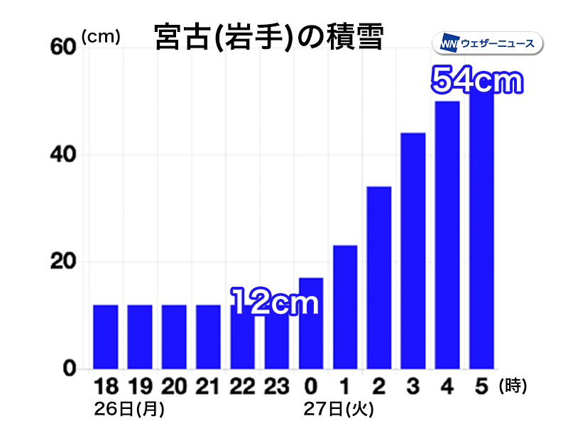 昨夜遅くからは特に岩手県の沿岸部で雪が強まり、宮古市では3時間に27cm、岩泉町では26cm積雪が増加しました。いずれも観測史上1位の記録です。また、宮古市の積雪は5時に54cmまで増え、10年ぶりに50cmを超える積雪を観測しています。