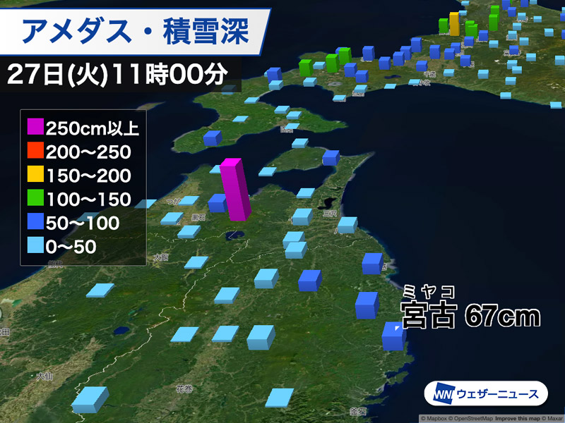 岩手県宮古では昨夜23時には12cmだった積雪深が11時には67cmに増加。12時間で55cm増えており、3・6・12・24・48・72時間でそれぞれで各時間降雪量(日最大)が観測史上1位の記録となっています。