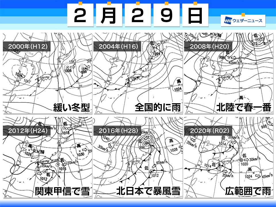 2月前半頃までの真冬の日本列島は、西高東低の冬型の気圧配置の日が多く、毎年同じような天気になる可能性が比較的高くなります。2月29日の天気図を見ると、冬型の気圧配置となっているのは2000年の1回のみで、残りの5回は低気圧や高気圧の通過が目を引きます。