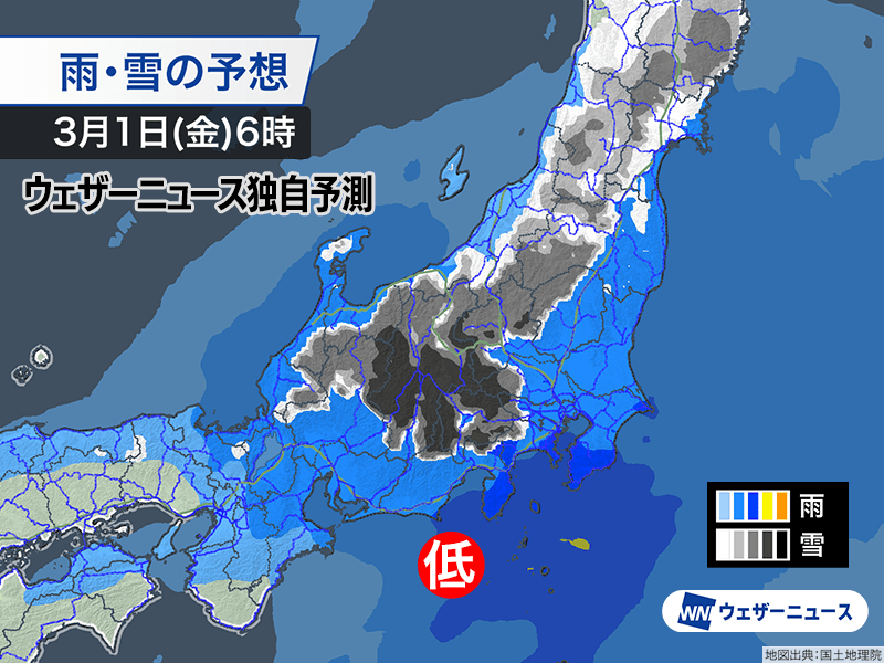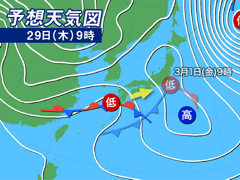 月をまたいで3月1日(金)の朝には低気圧が関東の南岸に到達し、東北~東日本の広い範囲で雨や雪が降る予想です。