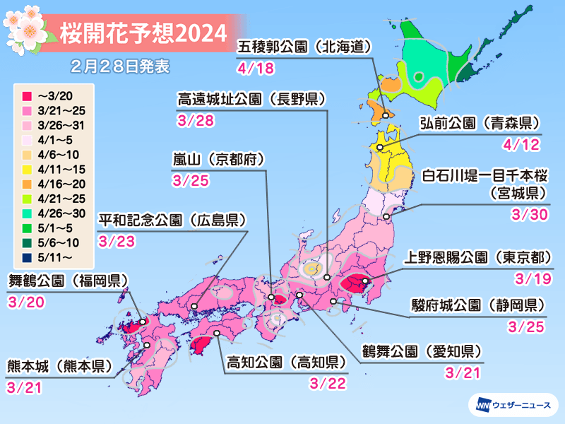 ウェザーニュースでは今日2月28日(水)、2024年の「第四回桜開花予想」を発表しました。2024年の桜の開花は平年より早まるところが多く、西日本や東海では平年並のところがある予想です。ソメイヨシノの開花トップは東京の3月18日の予想で前回の発表から変わらず、20日に福岡、横浜が続きます。