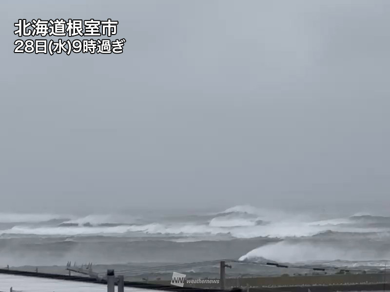 北海道根室では未明に最大瞬間風速28m/sを、その後も15~18m/s前後の風速を観測しています。強風の影響で海上でも波が高くなっていて、北日本太平洋側の各気象台では波浪警報を発表しました。