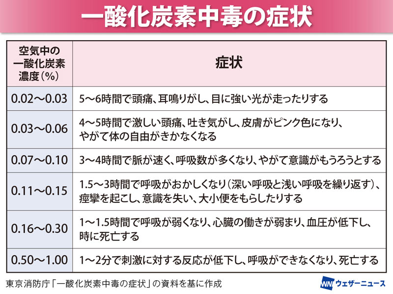 これは、一酸化炭素中毒が起こるからです。0.16~0.3%でも、1~1.5時間で呼吸が弱くなり、心臓の働きが弱まり、血圧が低下し、時に死亡します。