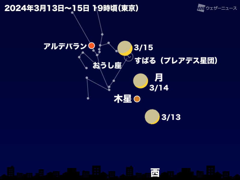 また、細い月が3月13日(水)~14日(木)には木星に接近し、15日(金)にはすばるに接近します。月と明るい木星やすばるの共演を、ぜひお楽しみください。
