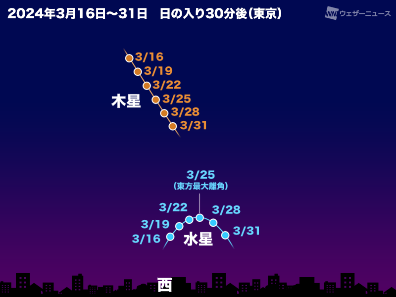 水星が3月25日(月)に東方最大離角(※)を迎えます。この日の前後は、日の入り直後の西の低空で水星が見やすくなるため注目です。