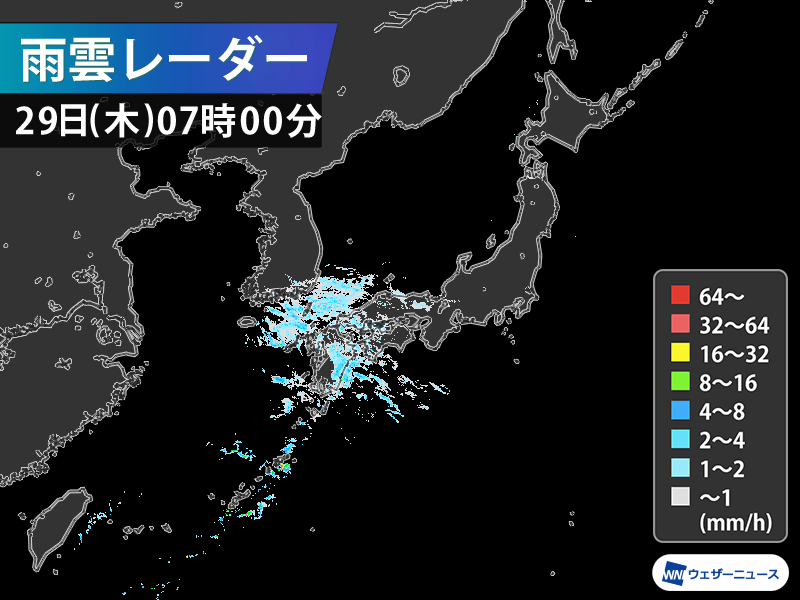 今日29日(木)朝は奄美など南西諸島や九州を中心に朝から雨が降っています。