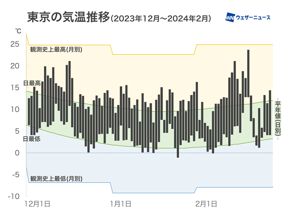 東京都心は冬の期間を通して気温が平年を下回る日が少ない一方で、平年を大きく上回る日が多くなりました。