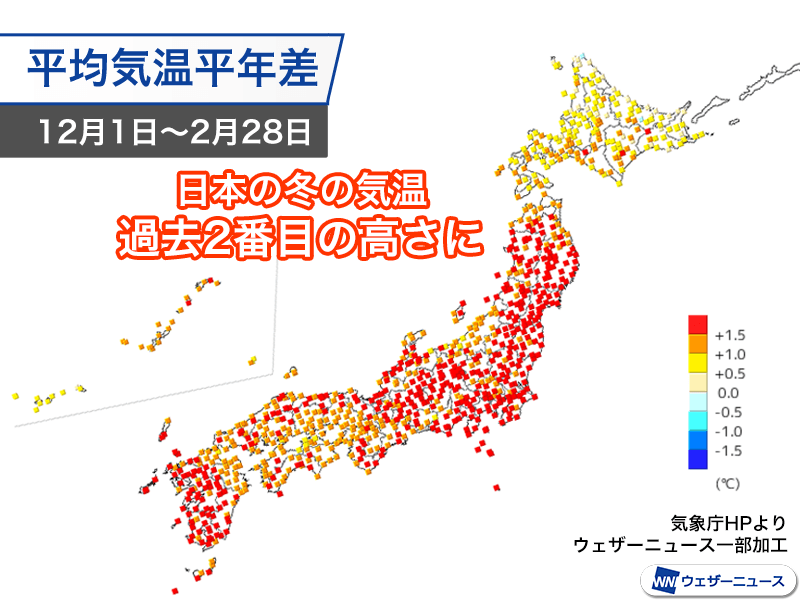 都市化の影響が比較的小さい全国15か所の代表地点(※)の観測値による、冬の日本の平均気温偏差は、2月28日までのデータで暫定的に計算した結果+1.27℃で、2020年寒候期の+1.43℃に次ぐ、過去2番目の高さになる見通しです。