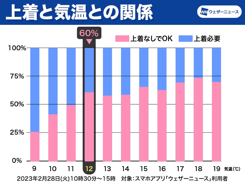東京、名古屋、大阪など西日本や東日本の市街地でも、朝は5℃前後と暖房が必要な寒さですが、昼間は14℃前後となり、晴れていると厚手のコートが邪魔になる暖かさです。