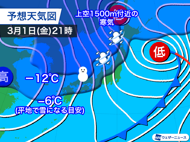 平地で雪になる目安の上空1500m付近で−6℃以下の寒気は西日本や東日本の太平洋側まで南下し、さらに強い−12℃以下の寒気が西日本の日本海側まで南下する予想となっています。