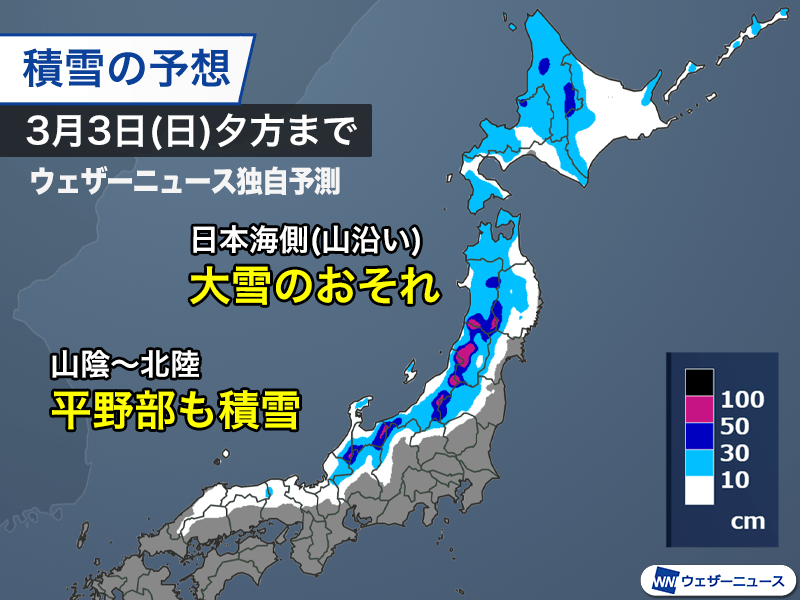 3日(日)夕方にかけての48時間に新たに積もる雪の量は、北陸や東北の山間部で最大50cm以上、内陸部や山沿いの広い範囲で10〜30cmに達する予想となっています。山陰や近畿北部、北陸の平野部でも雪が積もる見込みです。