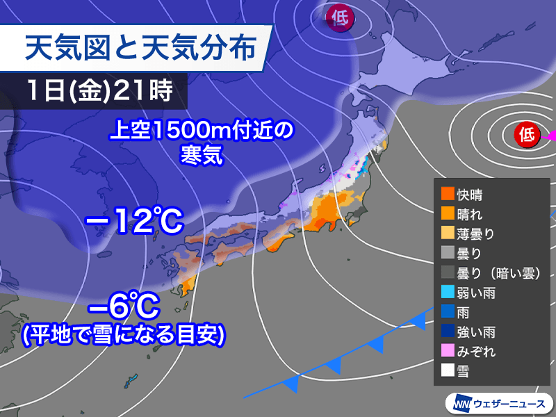 平地で雪を降らせる目安の上空1500m付近で−6℃以下の寒気は今夜の時点で西日本の大部分を覆い、−12℃以下のさらに強い寒気も山陰付近まで南下するとみられます。これだけ寒気が南下するのは1月下旬以来です。