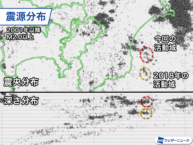 今回の活動に関しては2018年に比べて震源が北寄りであること。深さが2018年の60km前後に対し、30km前後であることなど、若干の違いがあります。また、実際にスロースリップが起きたかどうかの確認は現時点ではされておらず、因果関係については不明です。