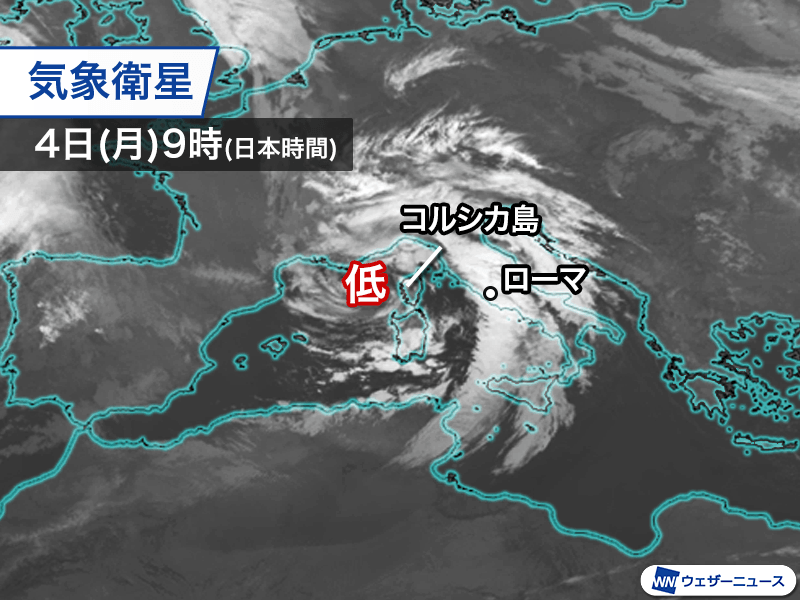 先週に続き寒気を伴った低気圧が地中海を進んでいます。日本時間の今日4日(月)の夜にかけてイタリアを通過し、局地的に風雨が強まる見込みです。