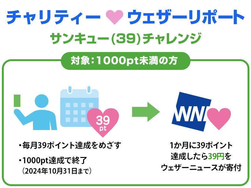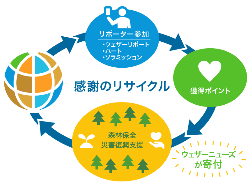「チャリティーウェザーリポート」とは開催期間中に空の写真の投稿(ウェザーリポート)やアンケート調査(ソラミッション)への参加などでたまるポイントを1ポイント1円に換算して、ウェザーニュースが寄付を行います。アプリユーザーの皆さんと一緒に被災地や森の環境改善を応援するチャリティー企画です。