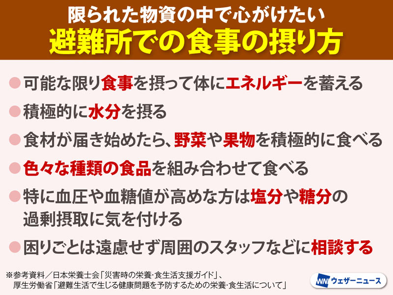 佐々木裕子「東日本大震災時の避難所における栄養・食生活状況と管理栄養士としての支援について」、日本栄養士会「災害時の栄養・食生活支援ガイド」、厚生労働省「避難所における食事提供の計画・評価のために当面の目標とする栄養の参照量について」、同「避難所における食事提供に係る適切な栄養管理の実施について」、同「避難生活で生じる健康問題を予防するための栄養・食生活について」、農林水産省「災害時に備えた食品ストックガイド」、内閣府「避難所におけるトイレの確保・管理ガイドライン」