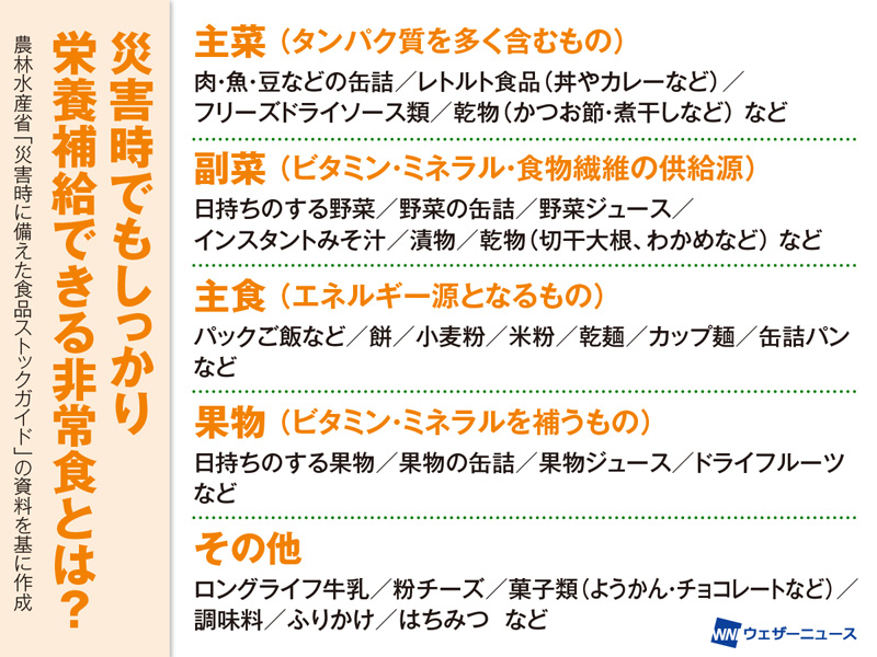 副菜としては日持ちのする野菜を多めに買い置き、野菜ジュースやドライフルーツ、乾物も用意しておきます。インスタントみそ汁や即席スープ、漬物なども準備しておくといいでしょう。