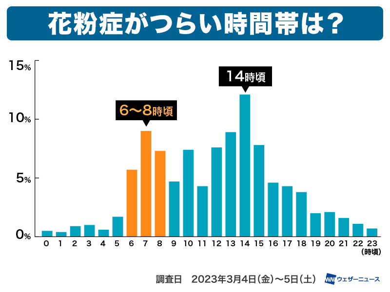ウェザーニュースが会員向けに行った調査(花粉症の方のみ対象)で、「花粉症がつらい時間帯はいつですか?」という質問をしたところ、一番多かったのが14時頃、2番目に多かったのが朝7時頃でした。(2023年3月4~5日実施、参加者:5,079人)