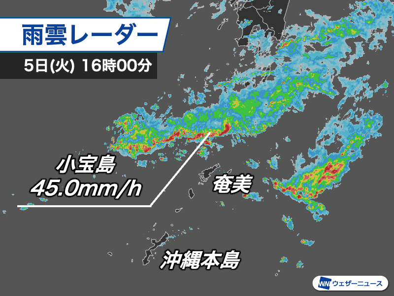 16時00分現在は鹿児島県のトカラ列島付近で雨雲が発達していて、小宝島では1時間に45.0mmの激しい雨を観測しました。雷も頻発しています。トカラ列島付近では今夜にかけて雨雲の通り道となり、局地的には1時間に60〜80mmの非常に激しい雨のおそれがあるため警戒が必要です。雷や突風にも十分お気をつけください。