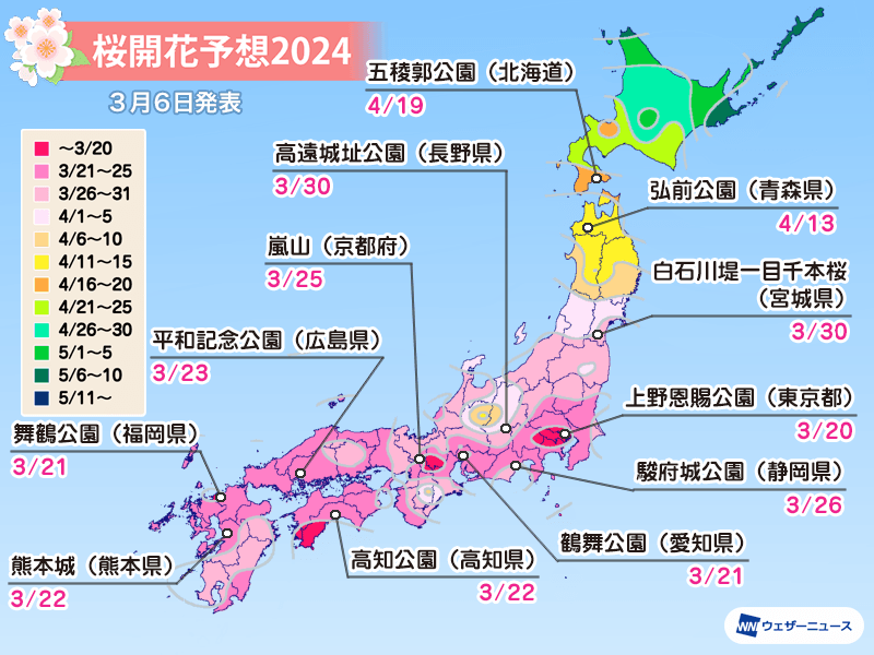 ウェザーニュースでは今日3月6日(水)、2024年の「第五回桜開花予想」を発表しました。2024年の桜の開花は九州や四国で平年並となりますが、その他広い範囲で平年より早まる予想です。ソメイヨシノの開花トップは東京の3月19日の予想で、21日に名古屋、福岡などが続きます。