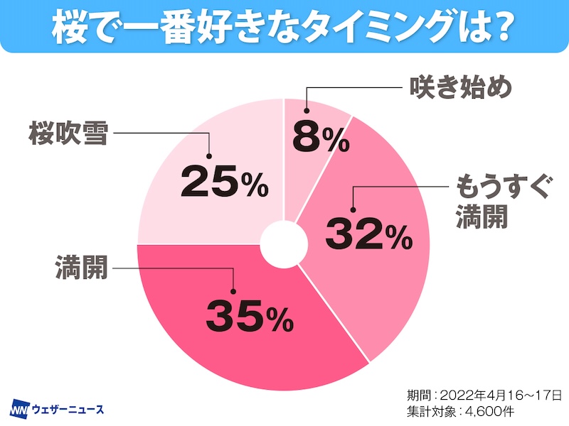 ウェザーニュースが2022年に実施したアンケート調査では「満開」がもっとも多く、全体の35%を占めました。次いで「もうすぐ満開」が32%という結果で、やはり満開に近いタイミングが人気のようです。
