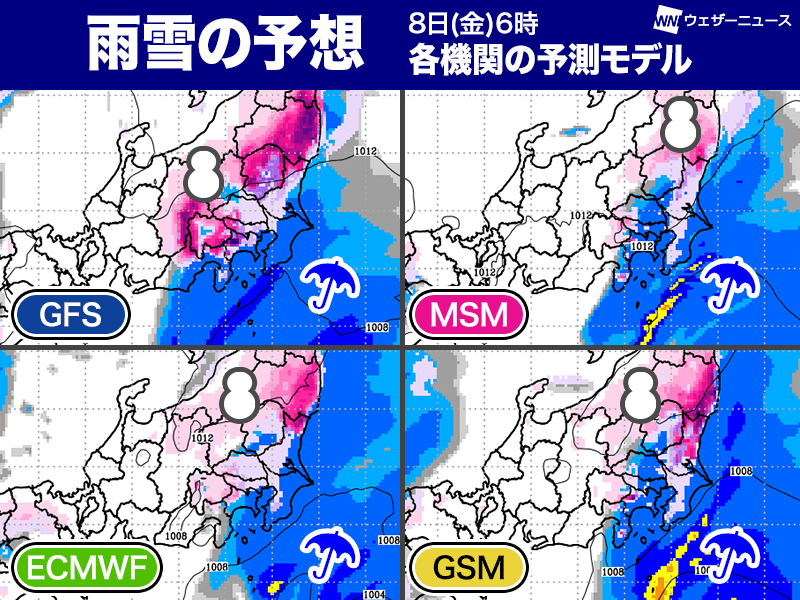 上記の図は、いくつかの予測モデルの8日(金)朝6時を予想したものです。青色系が雨、ピンク色系がみぞれや雪の予想を表し、ともに色の濃いほうが雨や雪が強まることを示しています。