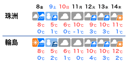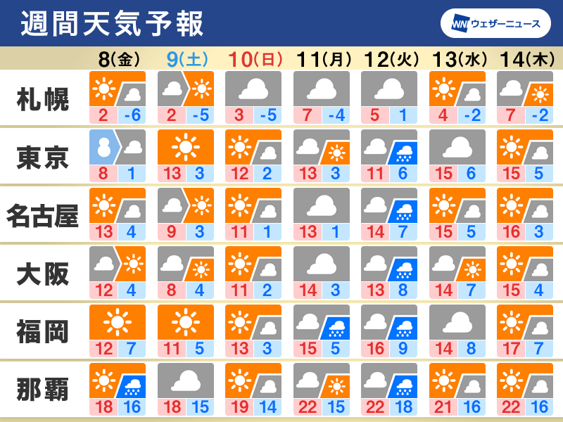 低気圧通過後は冬型の気圧配置になり、10日(日)にかけて北日本や東日本には寒気が流れ込みます。日本海側では雪の降るところが多く、降り方が強まることがあるので注意が必要です。