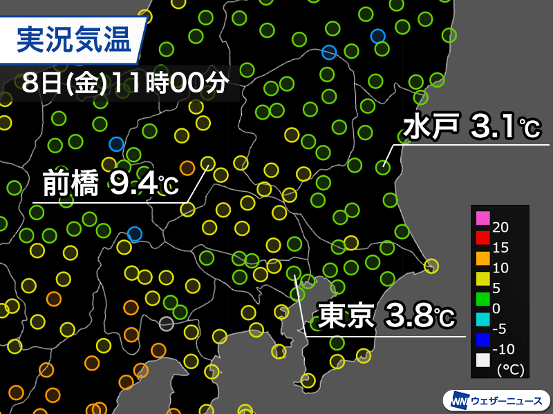 天気の回復が早かった群馬県や埼玉県北部は日差しが戻るとともに気温が上昇し、すでに10℃近い所があります。東京都心は雨が止んだものの、11時00分の時点ではまだ3.8℃と空気は冷たいままとなっています。午後は雨や雪が続いている千葉県や茨城県も含め、8〜9℃くらいまで上がる予想です。