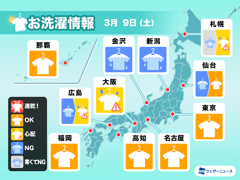 東日本や西日本の太平洋側は日差しが届き、関東も天気が回復して洗濯物の外干し日和となります。ただ、関西や瀬戸内では変わりやすい空でにわか雨に注意が必要です。外出する場合は、部屋干しにした方が良さそうです。