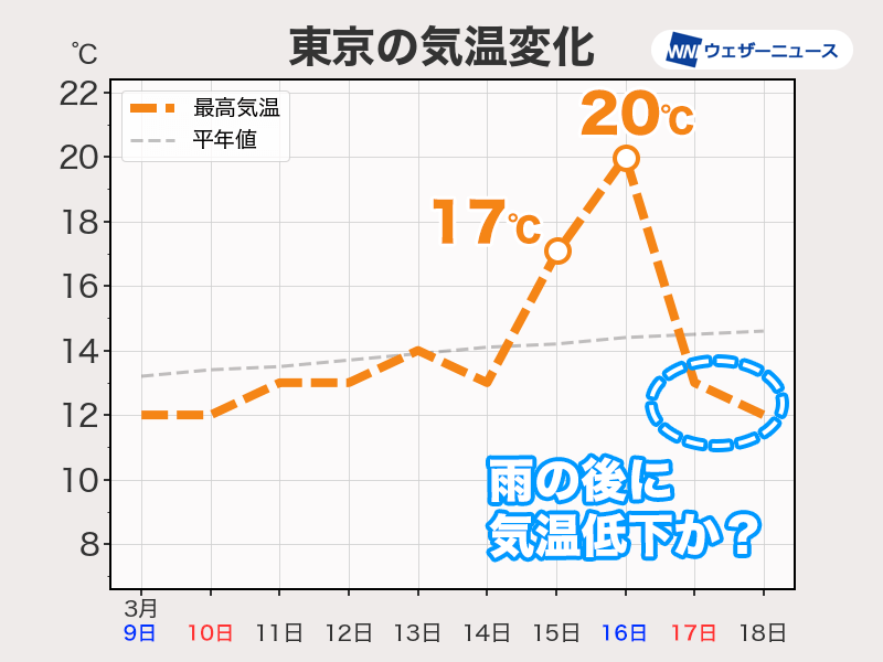 特に晴れる所が多い15日(金)〜16日(土)にかけては春本番の暖かさとなり、16日(土)の東京都心や名古屋市は20℃の予想となっています。ただ、17日(日)は低気圧の通過する見通しで、低気圧のコースによっては再び冷たい空気が優勢になる可能性があります。