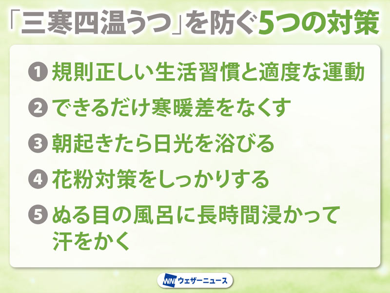 三寒四温の寒暖差は身体に負担がかかるばかりでなく、心の不調を招くことがあります。5つの対策を実行して、明るい春を迎えましょう。