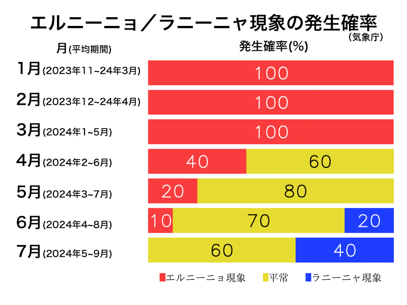 4月にはエルニーニョ現象が継続するよりも平常の状態に戻る確率が上回り、6月にはエルニーニョ現象となる確率が10%まで低下して終息に向かう予想です。7月はラニーニャ現象の発生する可能性がやや高まります。