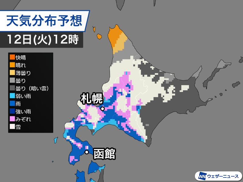 明日12日(火)は上空の気圧の谷の接近で、道南や道央を中心に天気の崩れる所が多くなります。寒気の流入が弱いため平野部では雨やみぞれとなる予想です。