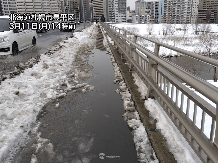 この陽気で積もった雪が急速に溶けていて、札幌市の積雪は昨日9時のピーク95cmから、今日の14時には80cmと一日あまりで一気に15cmも減少しています。一気に雪が溶けたことで一部では水が溜まった状態になっていて、かなり足元が悪い状況です。