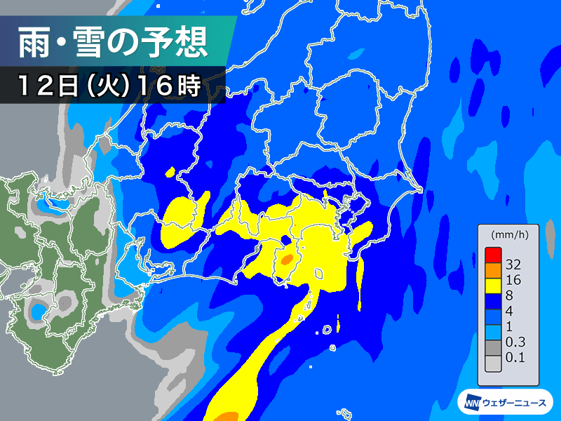 この後、三重県や愛知県では14〜15時頃にかけて、静岡県では17時頃にかけて断続的に強い雨が降り、局地的には1時間に30mmを超えるような激しい雨となる可能性があります。強雨による視界不良や道路冠水、落雷などに注意が必要です。