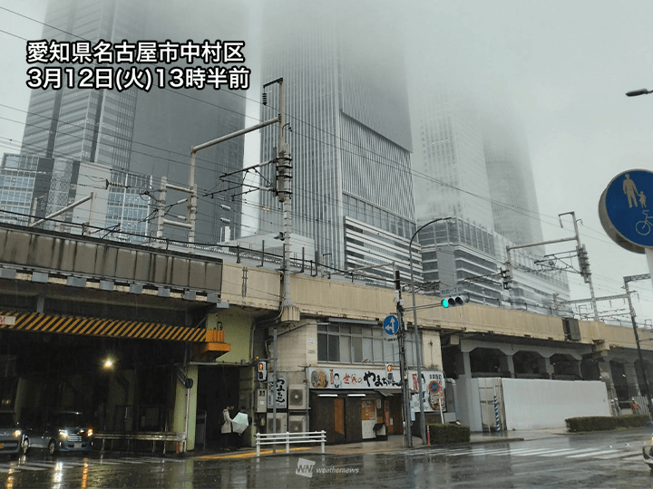 低気圧の東進に伴って活発な雨雲が近畿から東海へと移ってきました。低気圧に近い三重県を中心に活発な雨雲がかかり、13時30分までの1時間には三重県南伊勢町で37.0mmの激しい雨を観測しました。愛知県や静岡県にも発達した雨雲が広がっていて、名古屋市で10.0mm、静岡県浜松市で9.5mmの雨です。