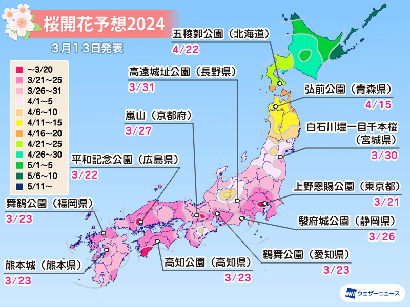 ウェザーニュースでは今日3月13日(水)、2024年の「第六回桜開花予想」を発表しました。2024年の桜の開花は平年並か平年より早まるところが多く、いよいよ来週3月20日(水)の春分の日に東京と広島で桜が開花する予想です。