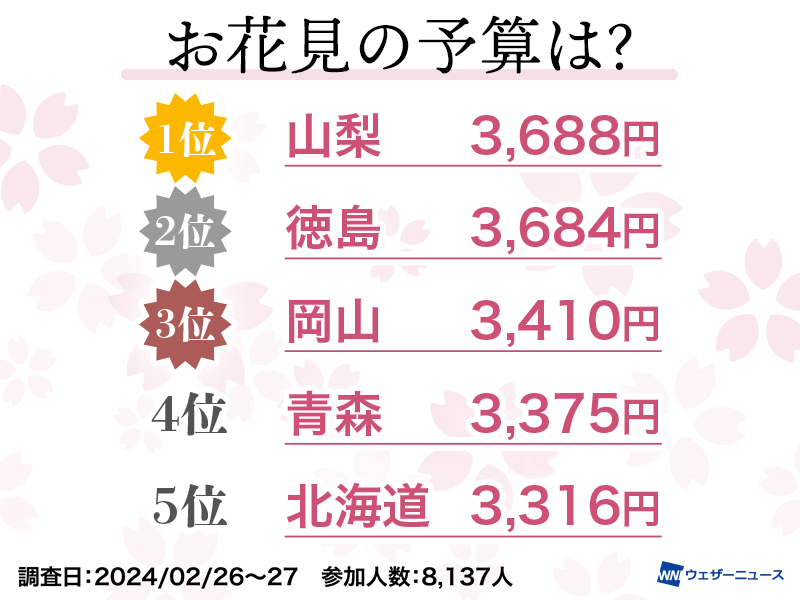 ウェザーニュースアプリのユーザーを対象にアンケート調査を行ったところ、今年のお花見予算は全国平均2831円となりました(「0円」という回答を除いて算出)。