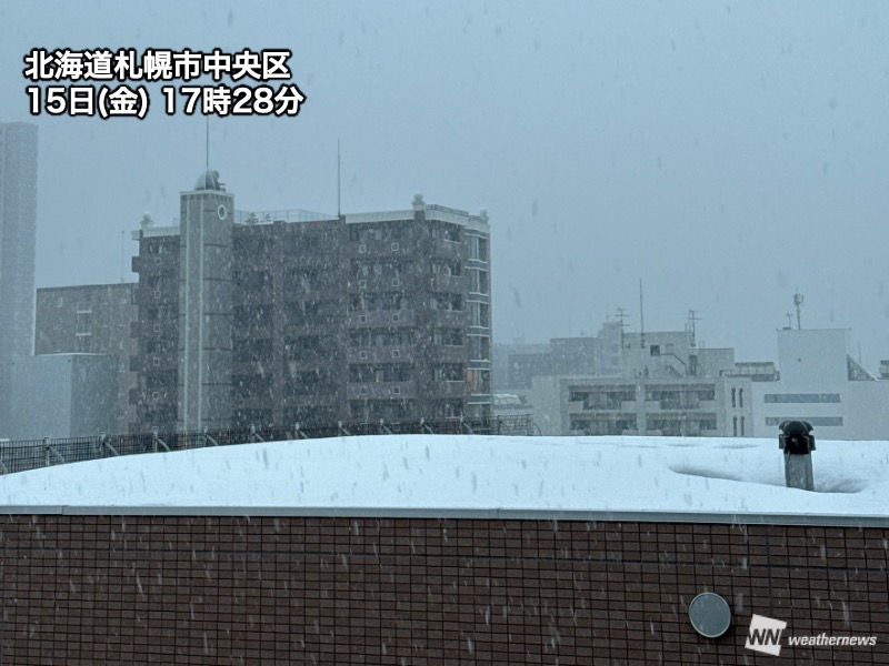 南から暖かな空気が流れ込んでいるため、降るものはみぞれや湿った雪になっています。札幌では1時間で2.0mmの降水を観測し、積雪が1cm増加しました。