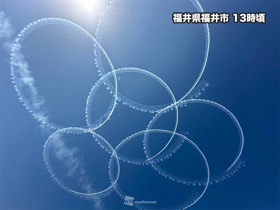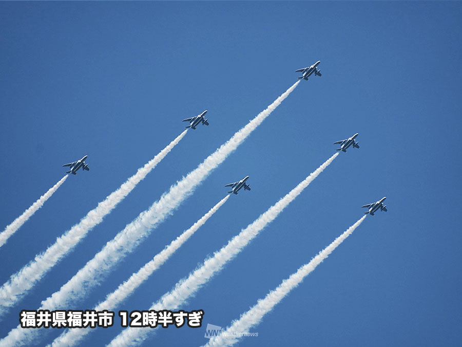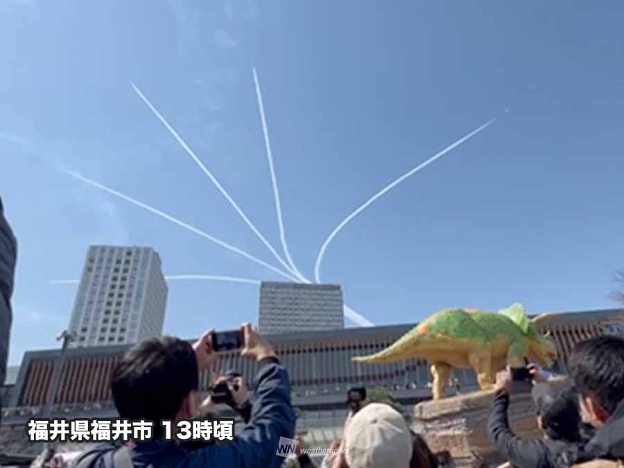 青空に白いスモークのかがやき 北陸新幹線開業でブルーインパルス展示飛行