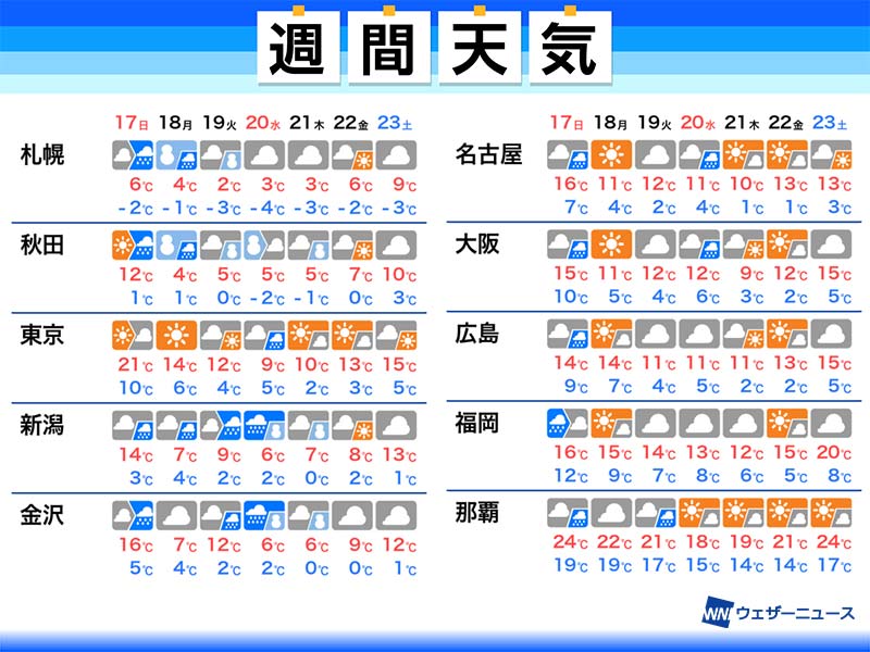 東京の最高気温を見ると、この週末は平年を大きく上回り、明日17日(日)も21℃を予想しています。一方、週明けの18日(月)は一気に下がって14℃と、気温変化が大きくなる見込みです。