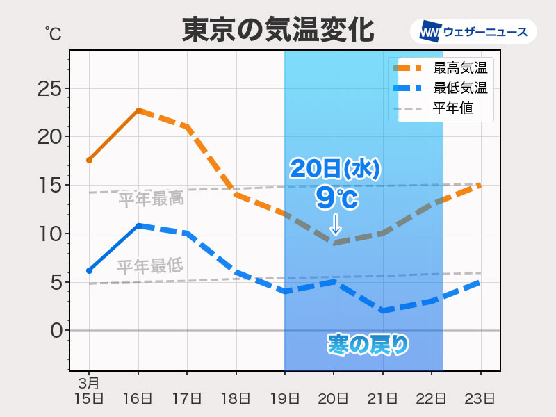 その後も平年より気温の低い日が続き、春分の日の20日(水)は9℃の予想です。また、朝の冷え込みも強まりそうです。