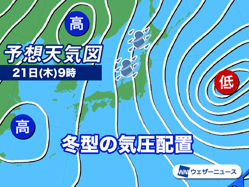 低気圧が東海上に進む20日(水)午後から21日(木)にかけては西高東低の冬型の気圧配置が強まります。
