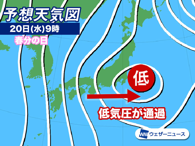 20日(水)の春分の日は、日本付近を低気圧が通過する見込みです。全国的に雲が広がり、近畿から東北にかけては雨や雪の降る所が多くなります。