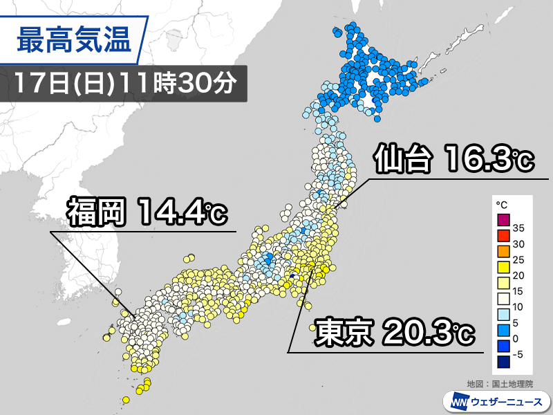 西日本から東北にかけては今日も上空の暖かな空気に覆われています。朝から気温は高めで、日差しが届いている関東や東北南部の太平洋側は早くも15℃以上の所が増えてきました。東京都心は11時09分に20℃に到達し、2日続けての20℃以上です。